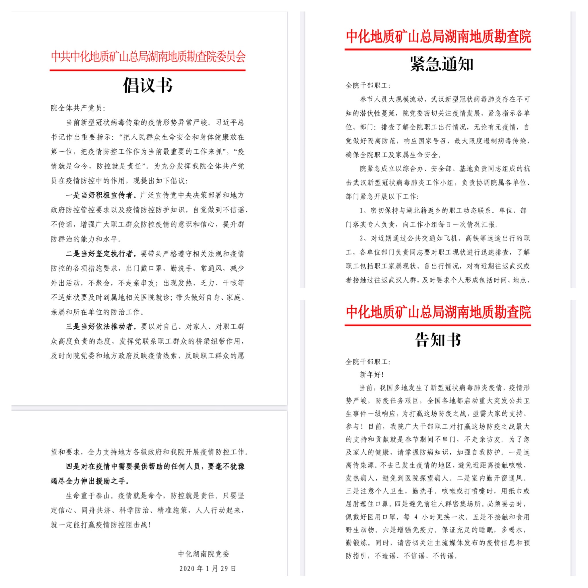 1月25日,我院党委部署下发《告全院职工书》,告知全院职工对打赢防疫之战最大的支持和贡献就是春节期间宅在家里、不串门、不走亲访友以及如何做好自我防护,要求不造谣、不信谣、不传谣。