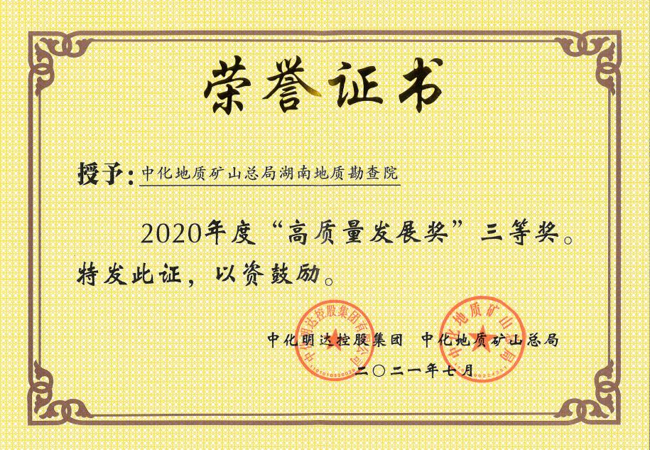 7月27日,中化明达控股集团(中化地质矿山总局)在呼和浩特召开2021年上半年经济运行分析会,深入学习贯彻习近平总书记“七一”重要讲话精神,部署动员下半年经济发展任务。会议通报了2020年度经营业绩直属单位负责人经营业绩考核结果,并对获得2020年度高质量发展奖和突出贡献奖的单位进行了表彰,其中,我院荣获“高质量发展奖”三等奖。