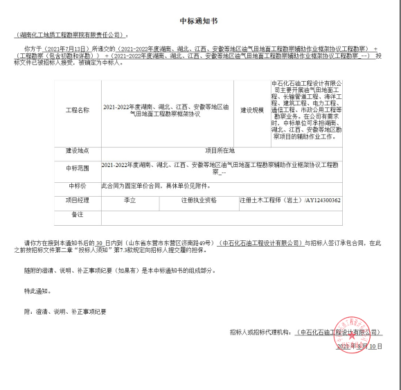 近日,我院接到中石化石油工程设计有限公司发来的中标通知书,成功中标2021-2022年度湖南、湖北、江西、安徽等地区油气田地面工程勘察辅助作业项目。