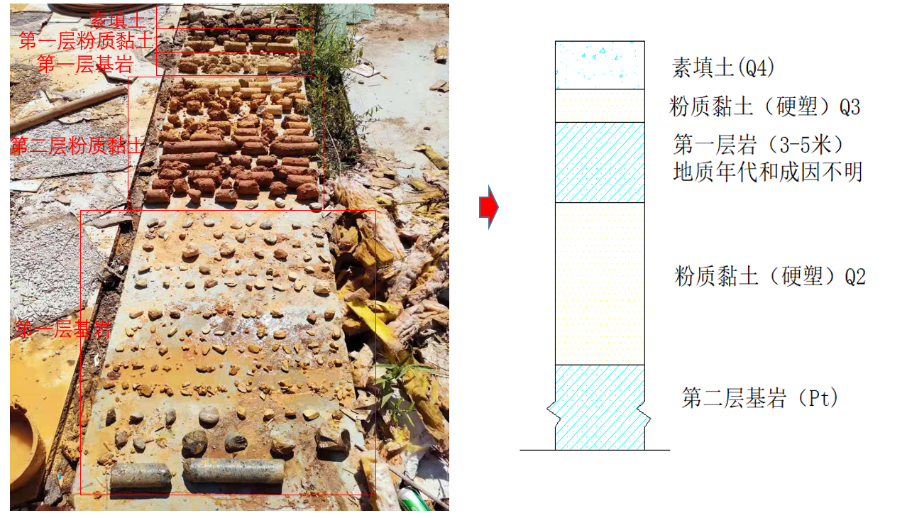 经黄主任、邹总和尹总对的现场岩芯的反复对比以及结合了剪切波速的测试结果综合考虑,同时也通过周围的原始居民对原始地形的描述,最终判定第一层岩为人工堆填而成,而非地质构造影响形成。